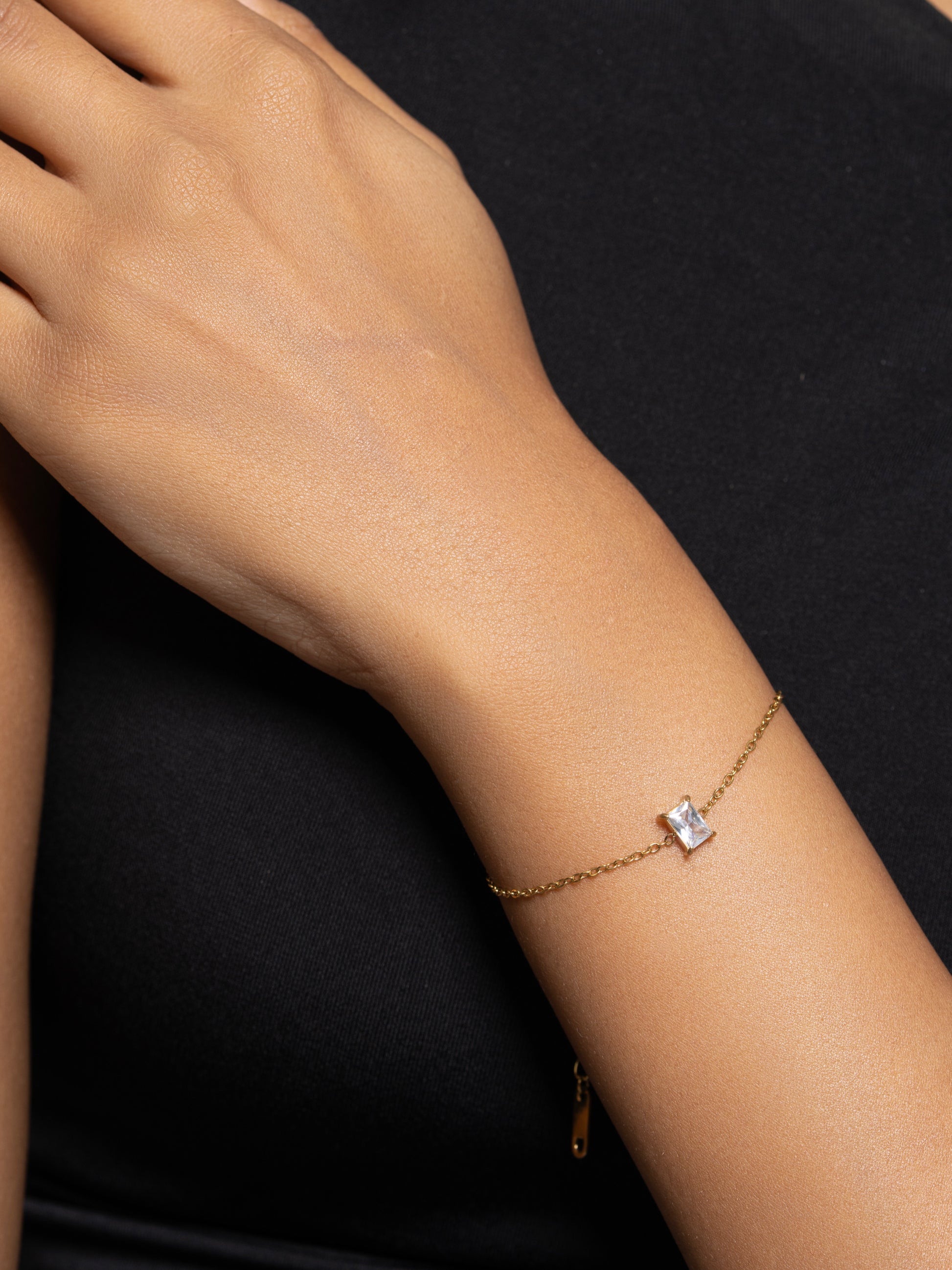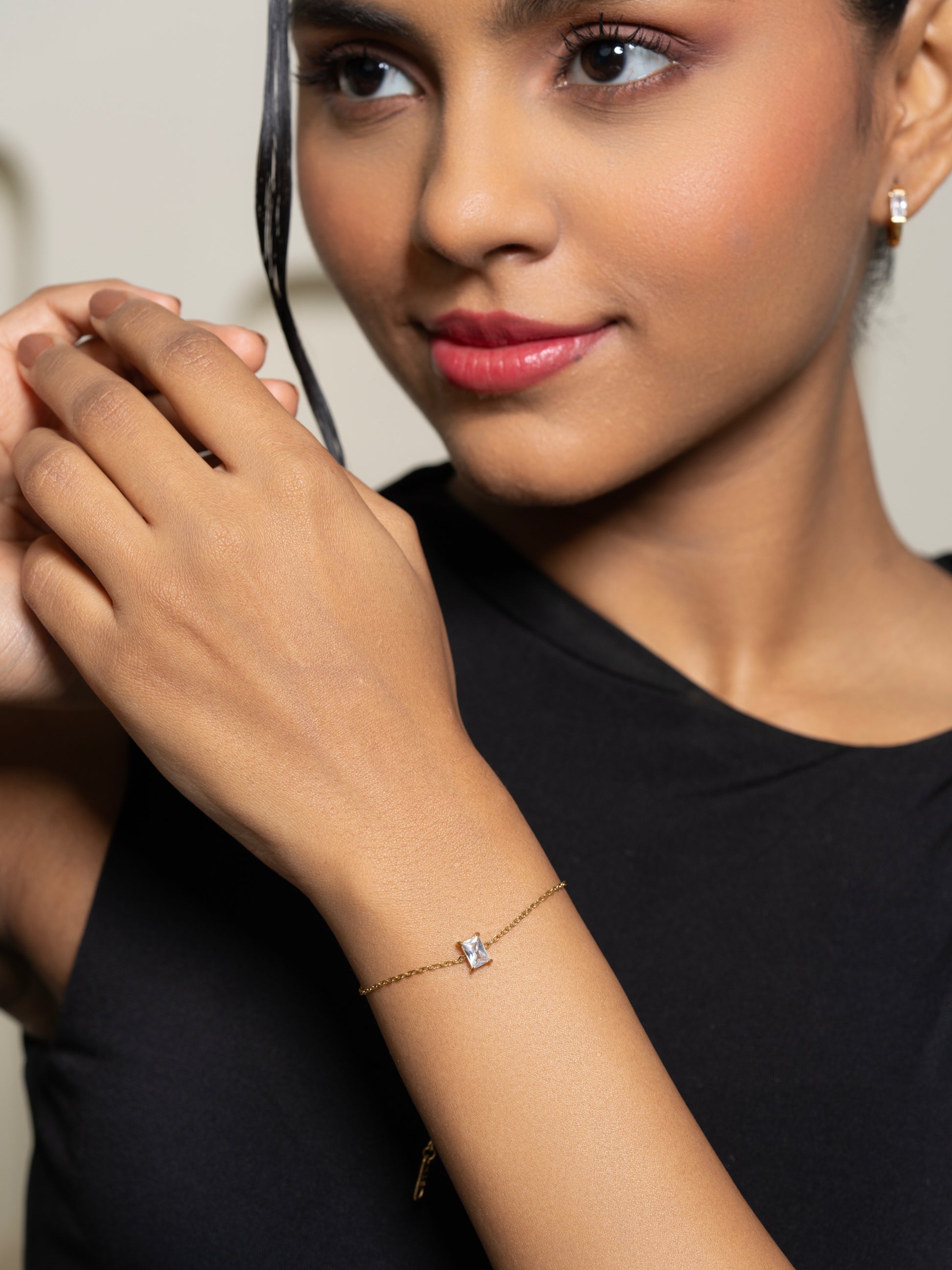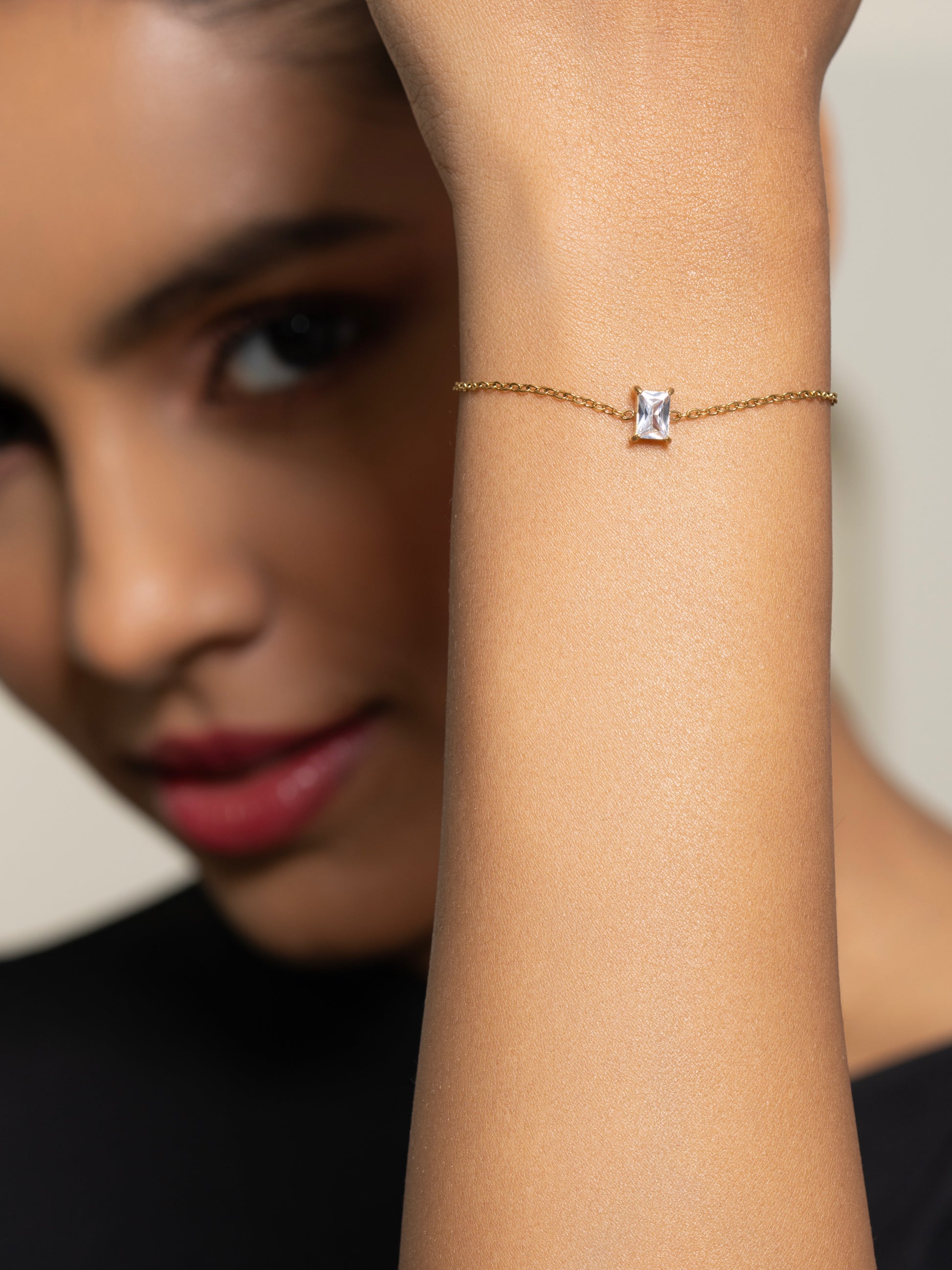 Baguette bracelet features a small, rectangular diamond-shaped stone set in the center of a minimalist gold-plated chain. The sparkling gemstone adds a touch of sophistication, making it a perfect accessory for any occasion.