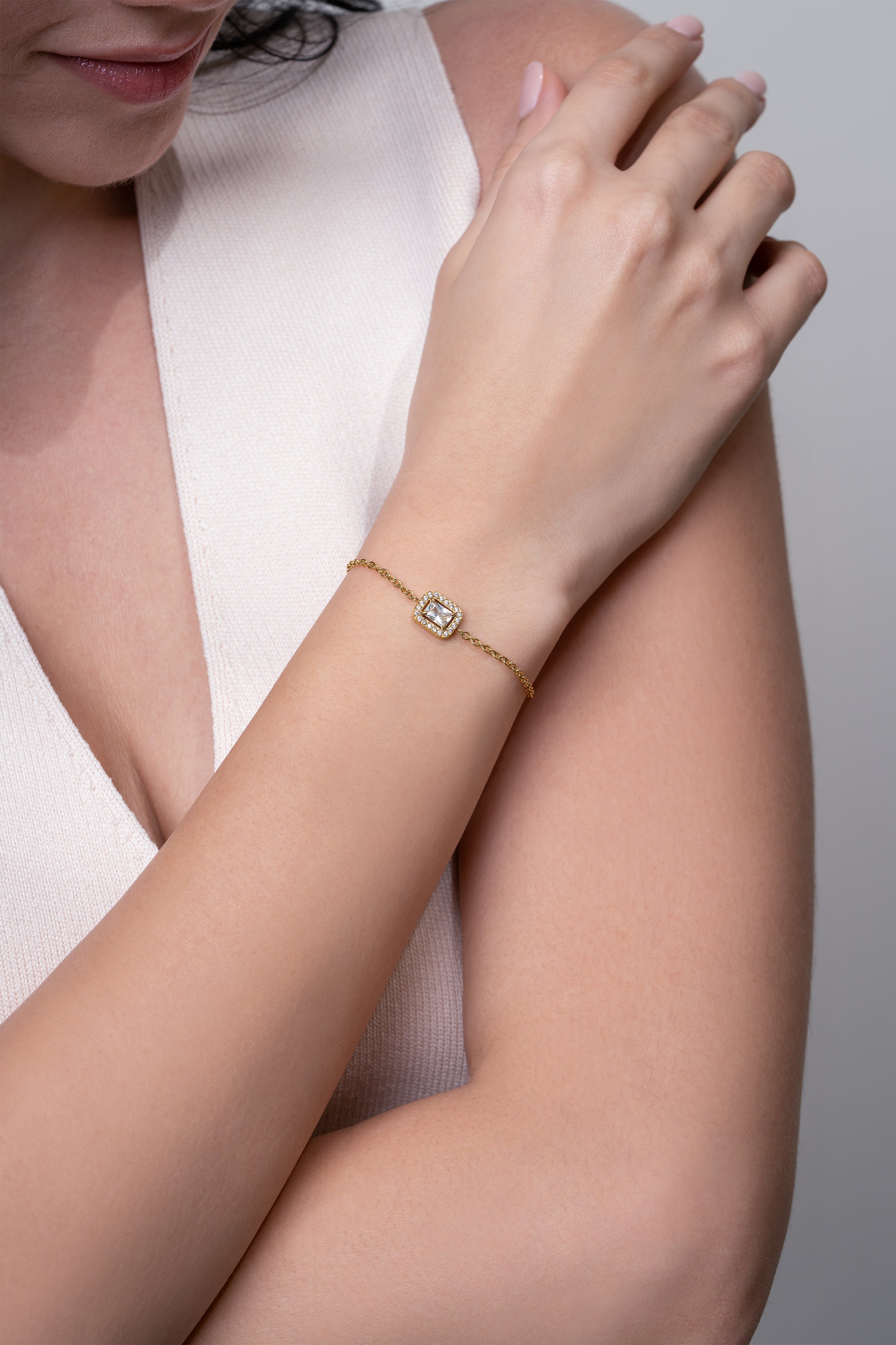 The Rectangle Halo Bracelet is a modern classic, designed in elegant hues to suit every style. Perfect for adding a refined touch to your everyday look.