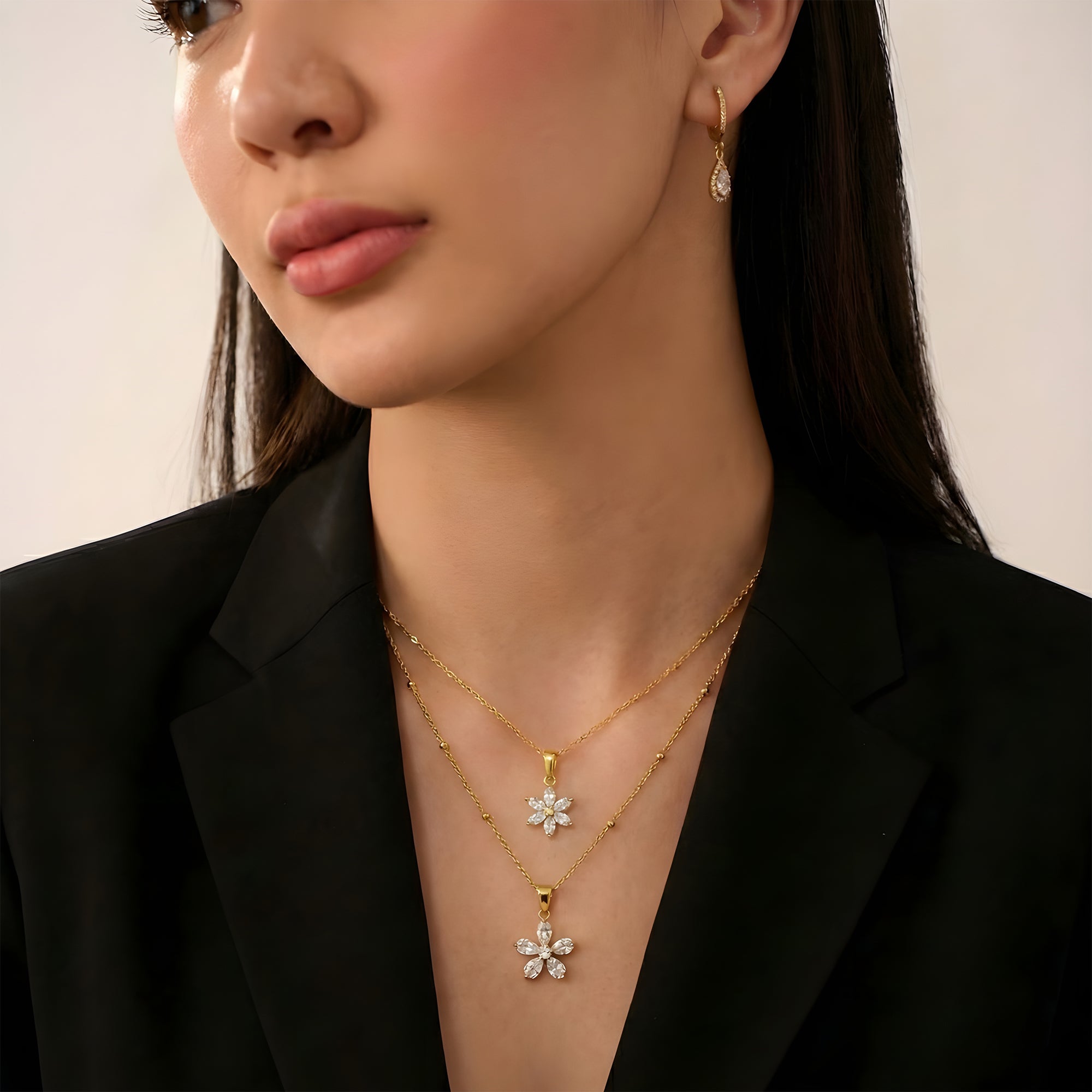 A sophisticated necklace duo crafted for modern elegance. The Flora Necklace offers delicate charm, while the Judith Necklace adds a bold focal touch. Together, they create a striking yet wearable layered look.