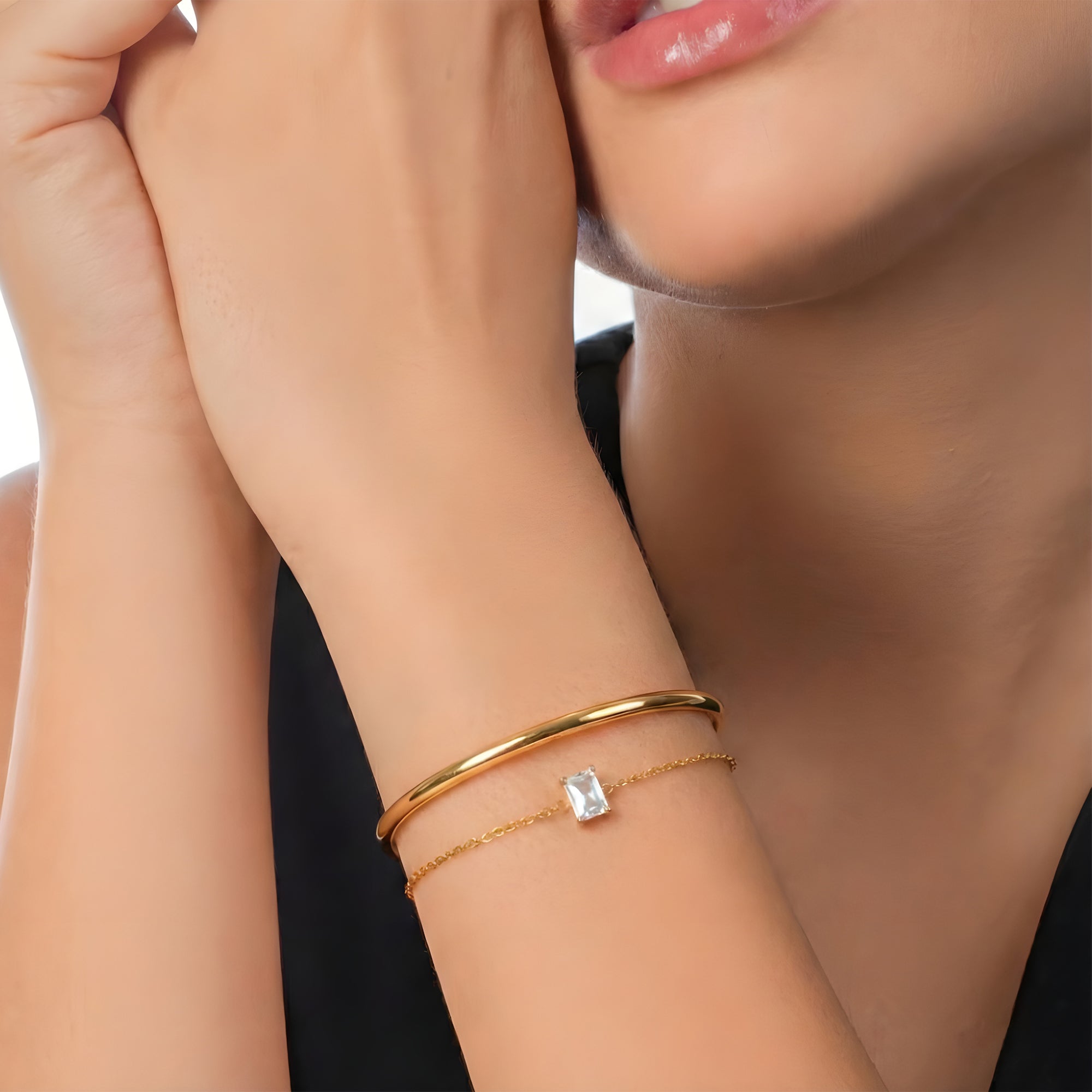 A modern wrist duo designed for bold elegance. The Hailey Cuff offers a sleek statement, while the Baguette Bracelet adds clean, structured sparkle. Together, they create a refined wrist stack.