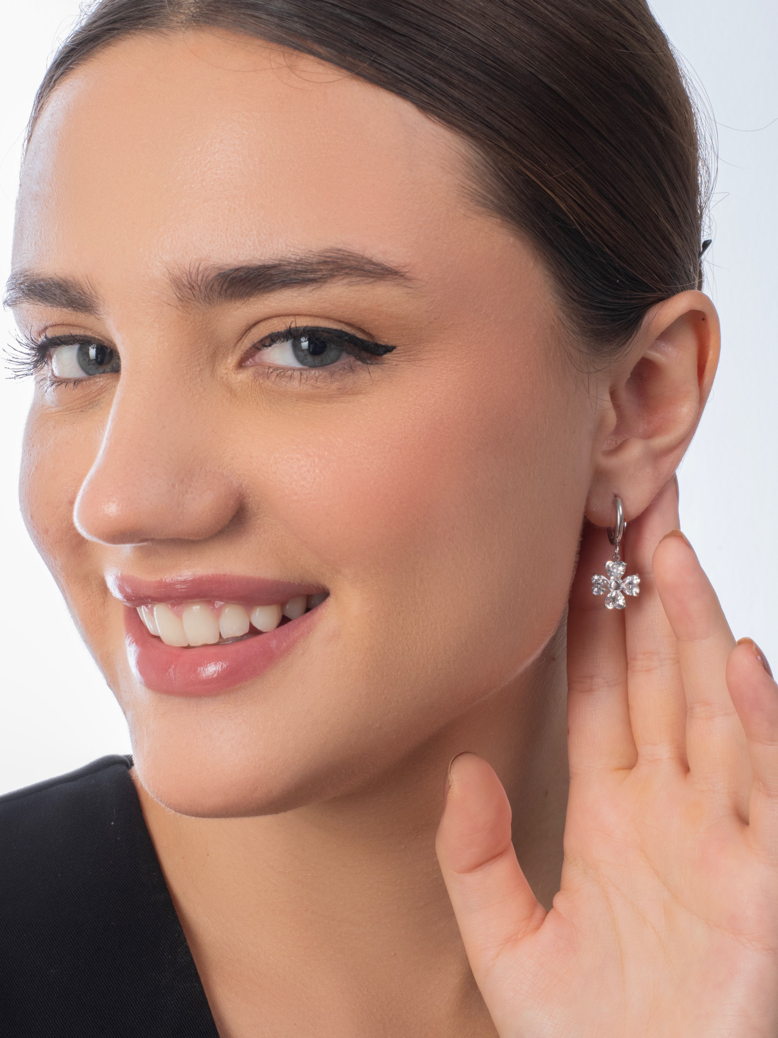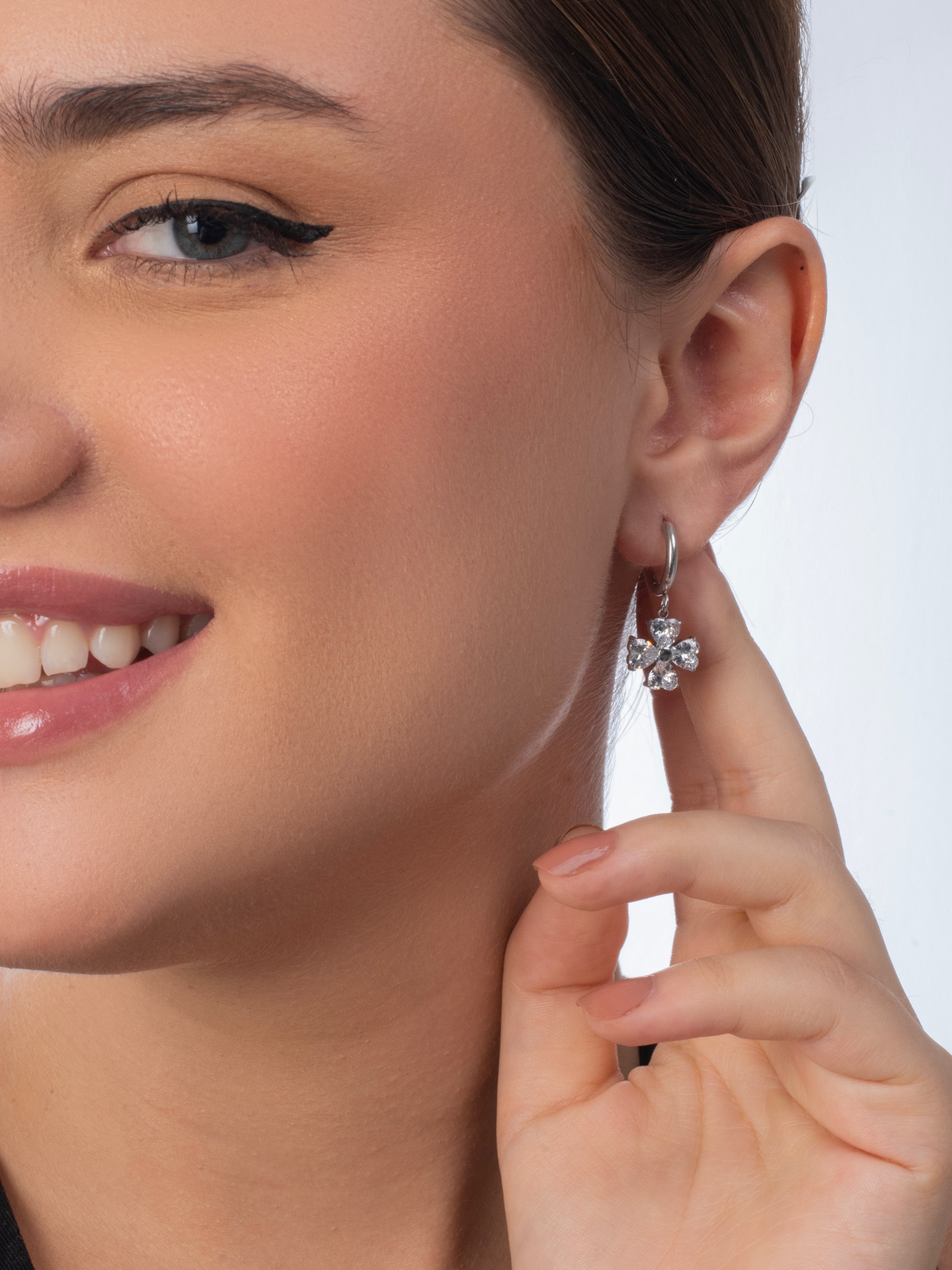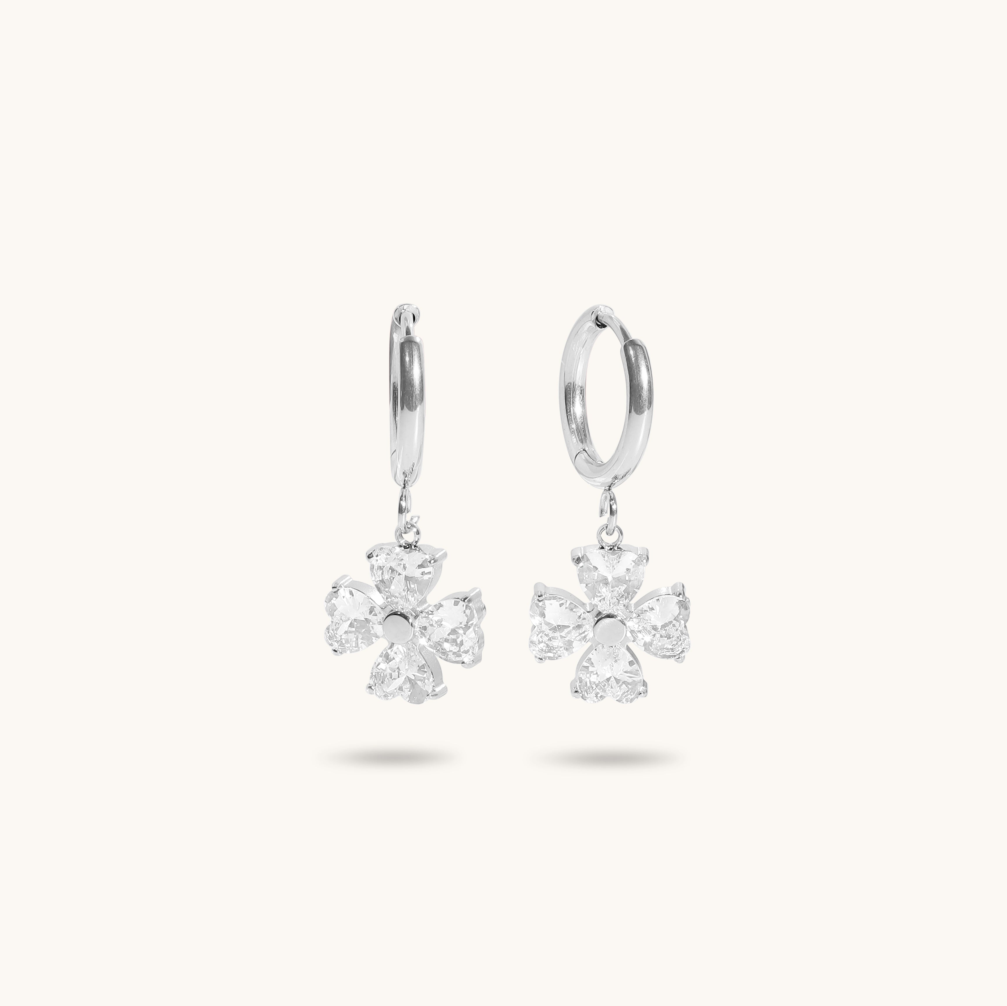 The Phoebe Huggies are elegant earrings featuring a delicate floral design with sparkling stones. Their versatile style makes them perfect for both casual and formal occasions, adding a touch of sophistication to any outfit.