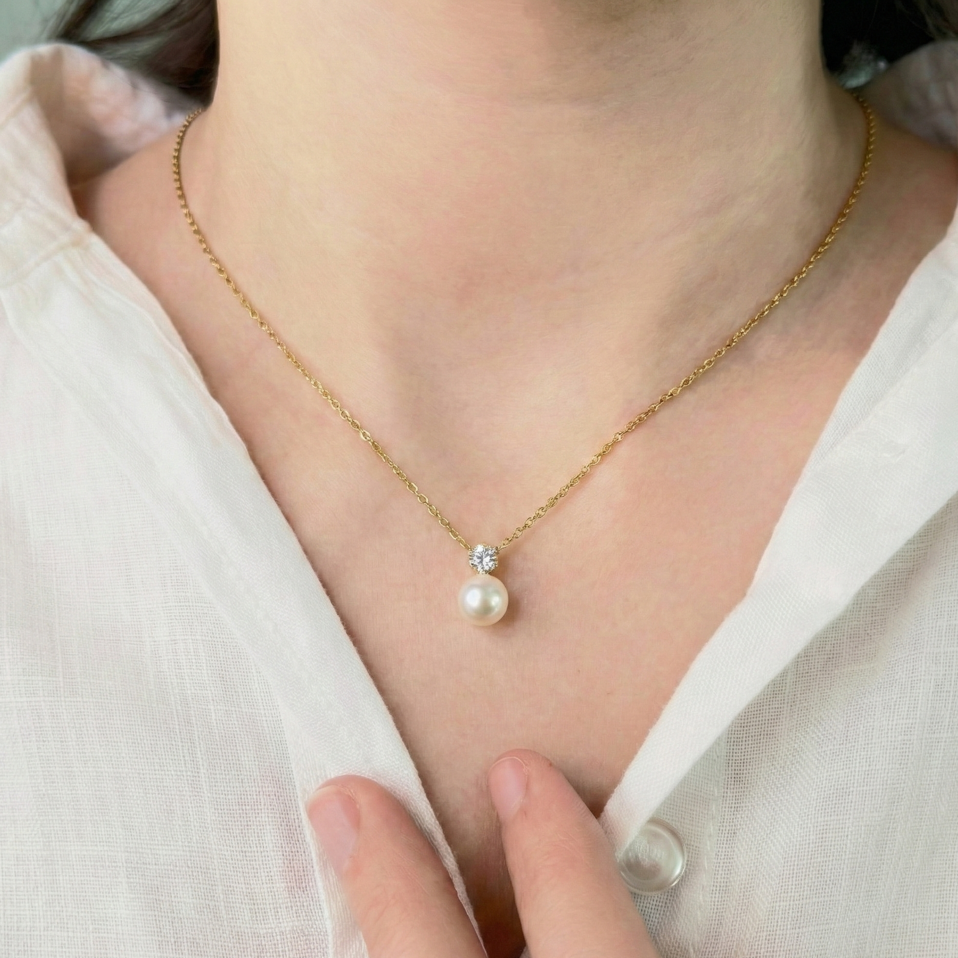 The Celest Pearl Chain is delicate and refined, crafted in demi-fine gold with a luminous pearl and a subtle sparkling accent.
