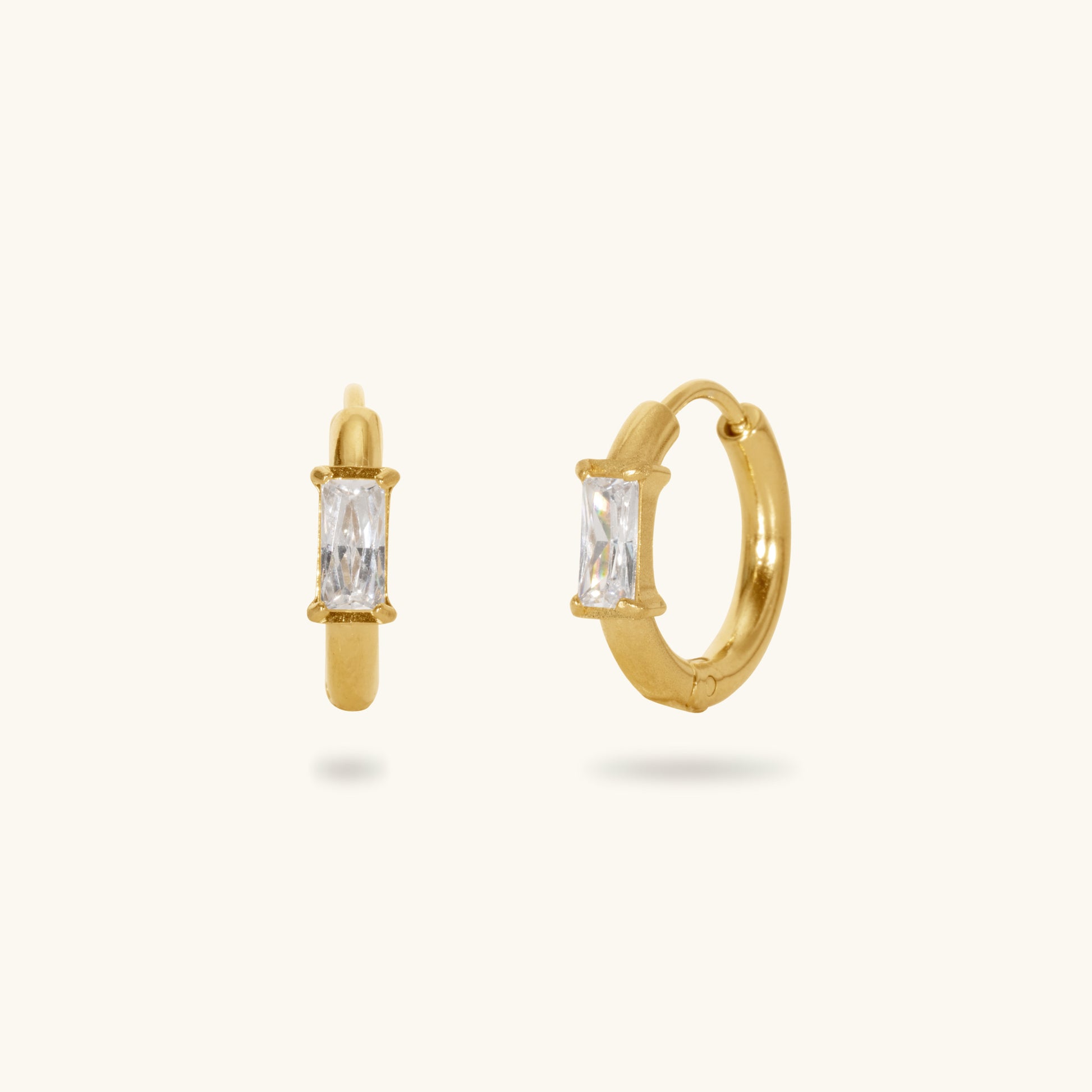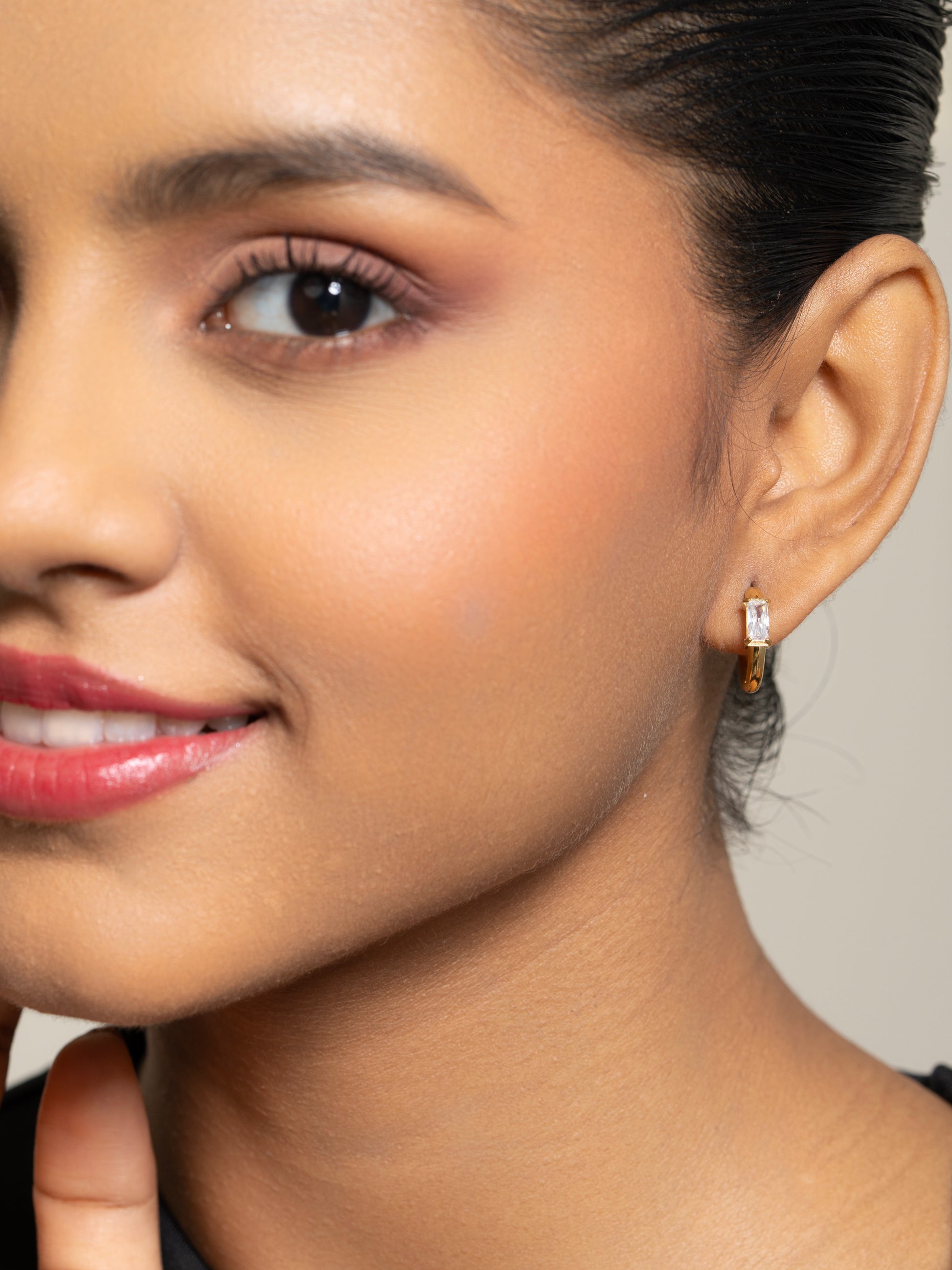 Daisy huggies are circular earrings which boast modern elegance with rectangular diamond embedded within, offering a blend of sophistication and contemporary style.