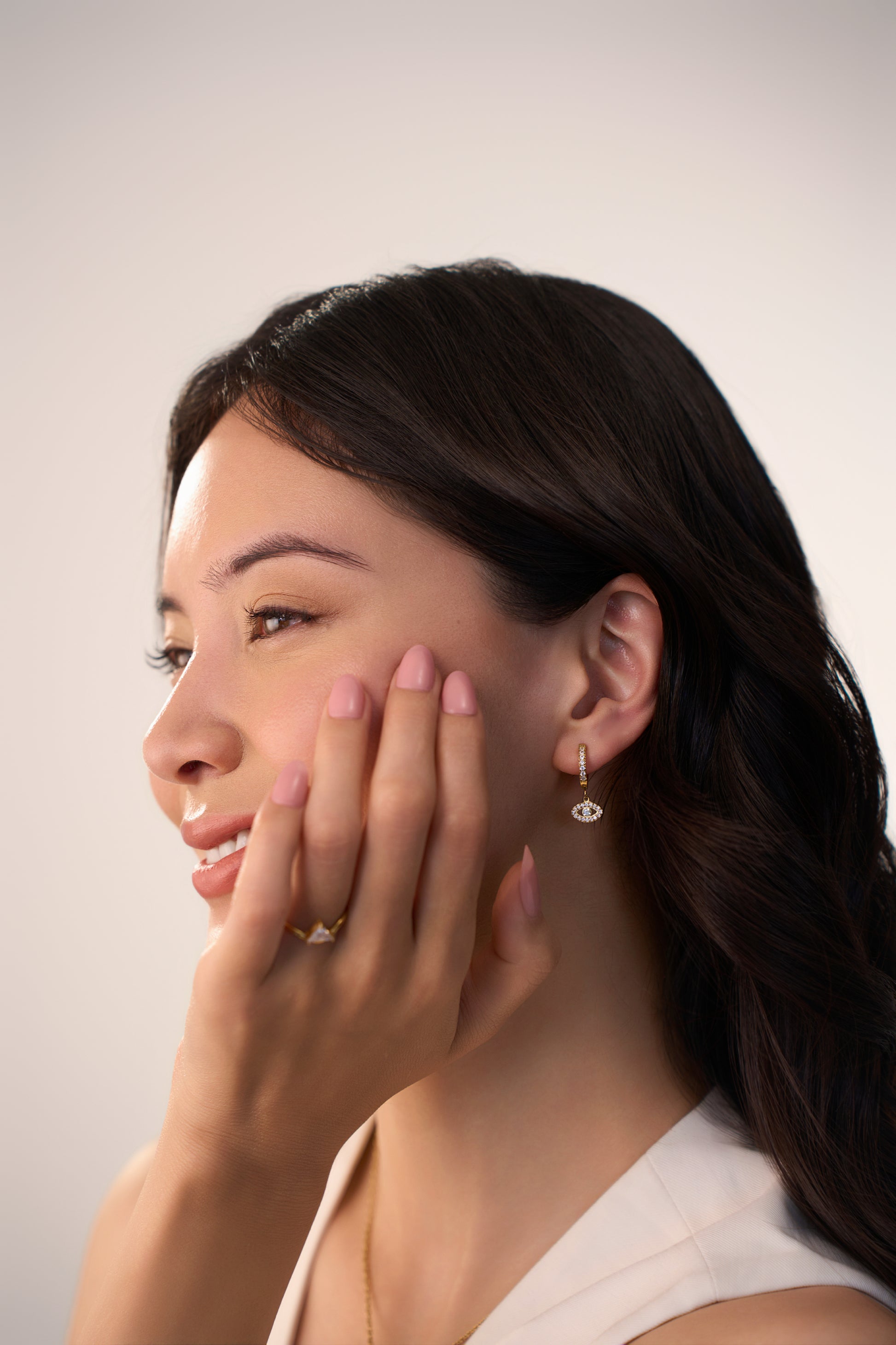 Add a touch of mystique to your jewelry collection with our Evil Eve Huggies. These earrings feature a delicate evil eye charm encrusted with sparkling stones, perfect for warding off negativity while adding a stylish flair to any outfit. Ideal for both casual and formal occasions, these huggies are a must-have accessory for the modern woman.