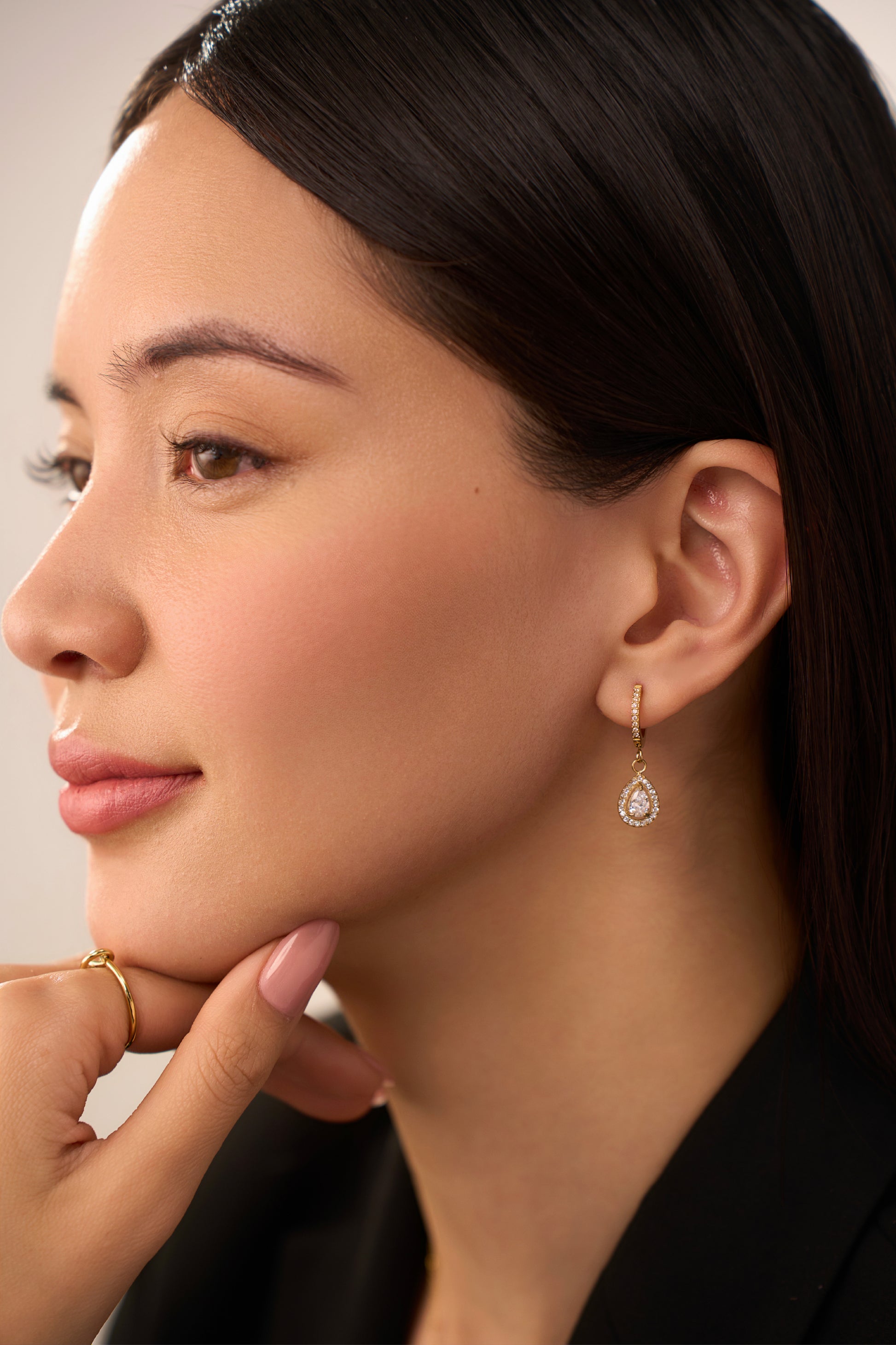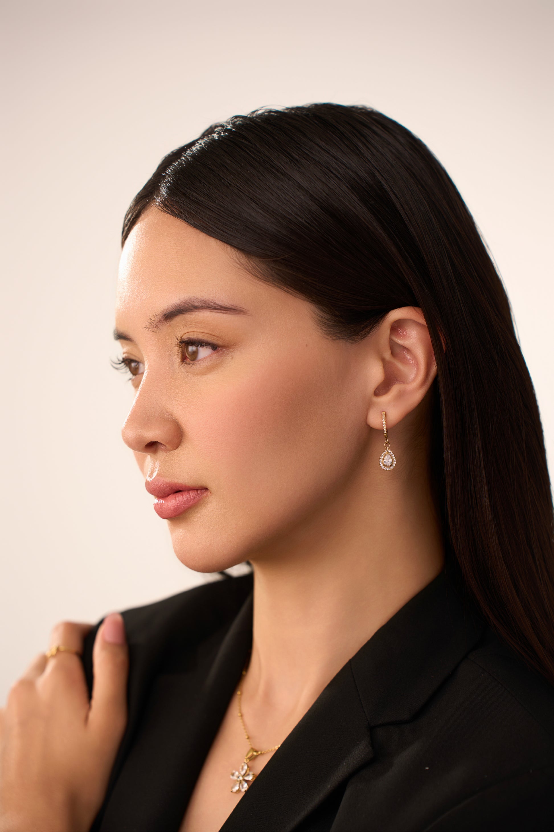 Exude sophistication with the Niara Huggies. These exquisite gold earrings, showcasing a clear teardrop gemstone surrounded by smaller stones, create a dazzling look that is perfect for special occasions. Whether you're dressing up for an evening event or adding glamour to your everyday wear, these huggies are a must-have in your jewelry collection.
