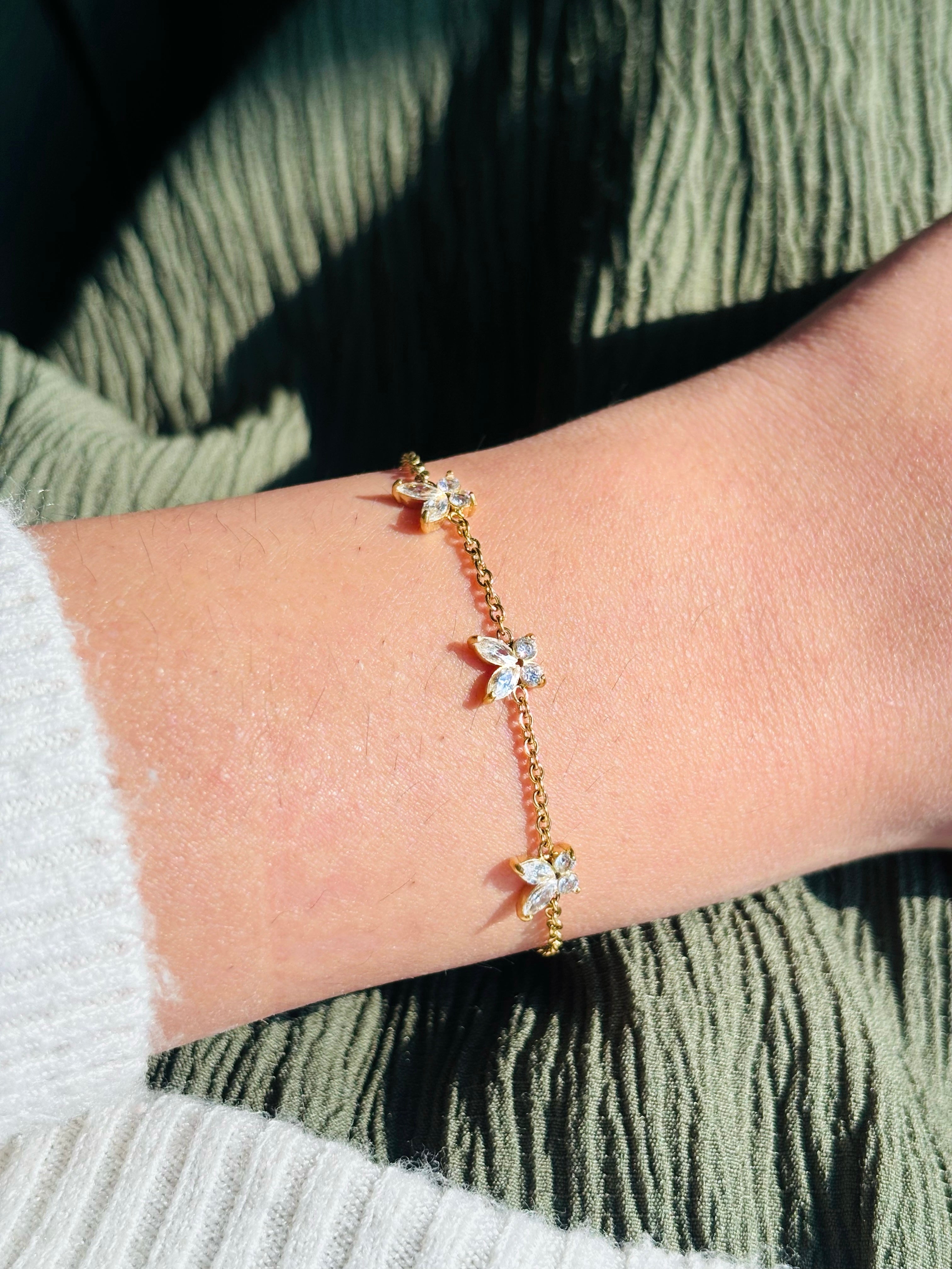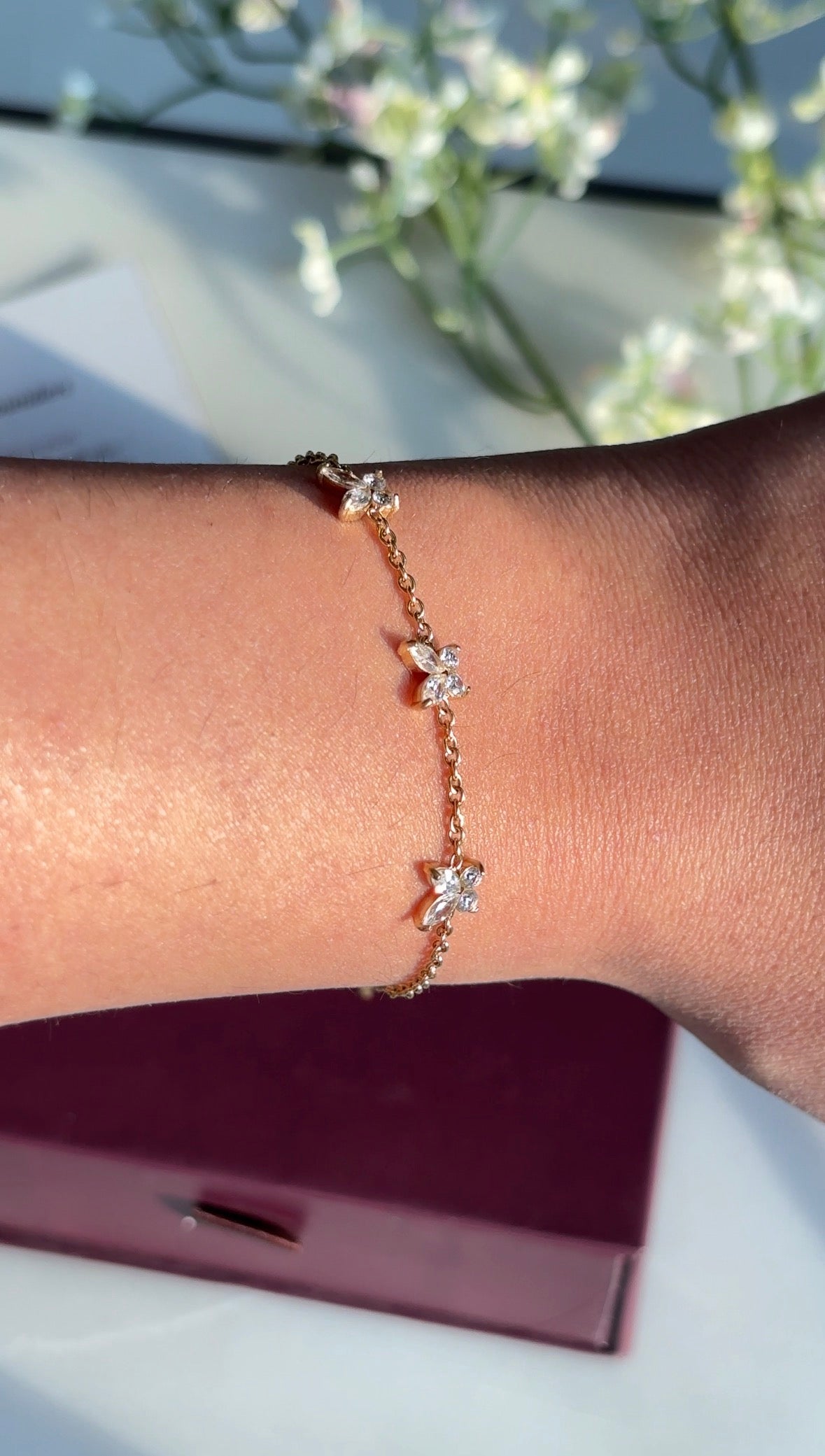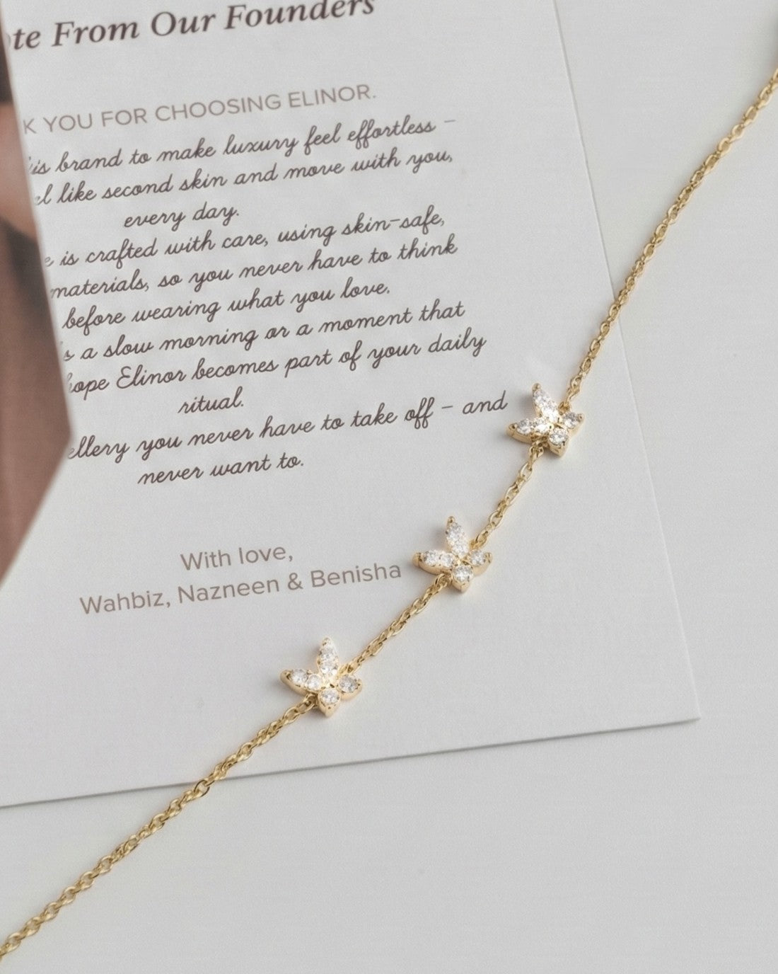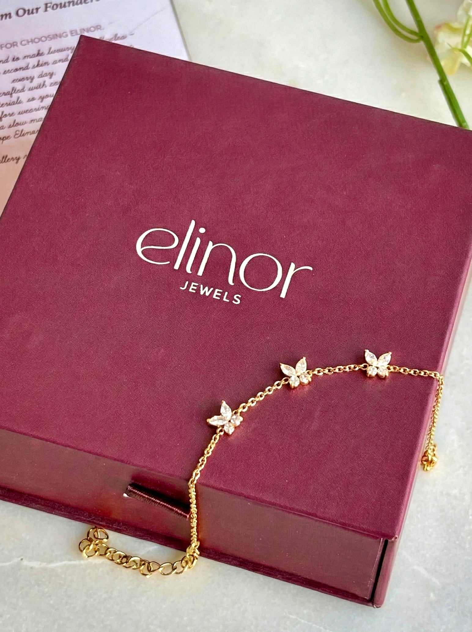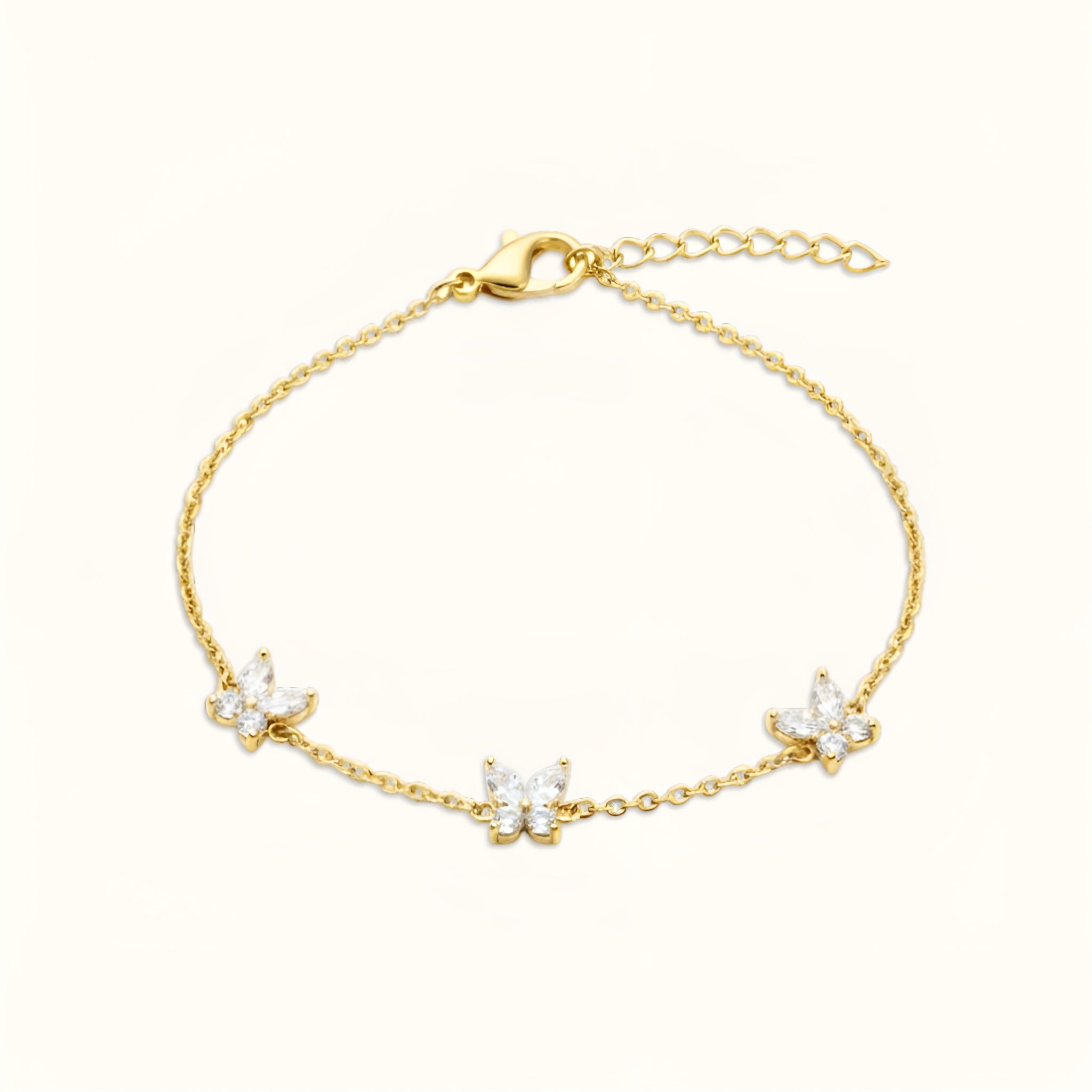 Evelyn Braceletis a delicate gold-toned chain adorned with three sparkling butterfly motifs that add a touch of charm and femininity. Designed to elevate both everyday and evening looks, it effortlessly blends subtle elegance with playful detail, making it a thoughtful gift for someone special.
